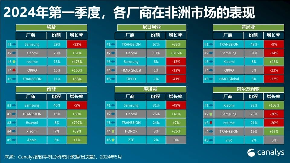 依据Canalys发布的陈述,2024年第一季度,非洲区域智能手机出货量同比陡增24%,达1820万部。这首要得益于各大供货商的新品发布和大多数商场通胀缓解。这也使非洲跻身于该季度全球智能手机增加速度第三的区域。与2023年第一季度比较,非洲大多数国家的经济增加速度均有所提高。